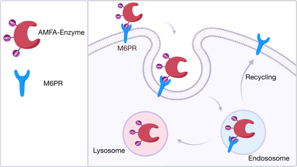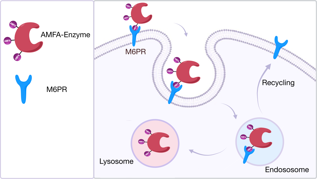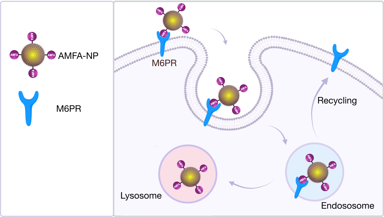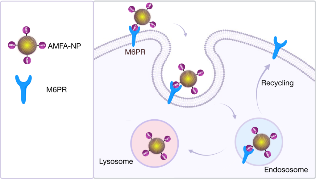 At Nanomedsyn, we develop AMFA glycovectors designed to target the mannose 6 phosphate receptor (M6PR) to enable precise intracellular delivery and selective lysosomal degradation of toxic disease‑driving antigens.