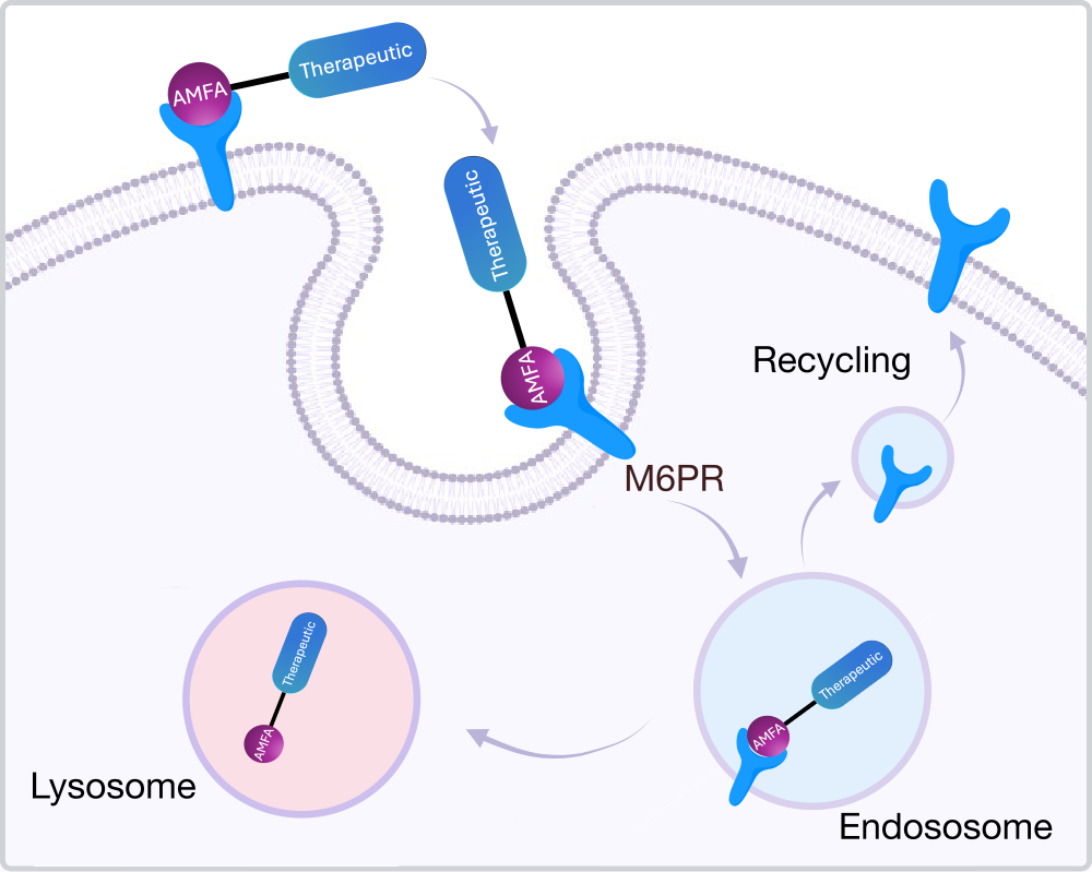 By binding M6PR at the cell surface, AMFA‑Therapeutics leverage the receptor’s native endocytic cycle to shuttle their attached therapeutic cargo into endosomes and onward to lysosomes.
