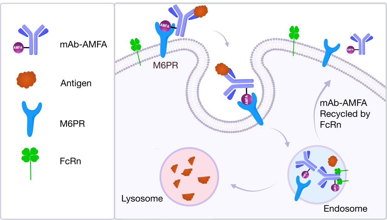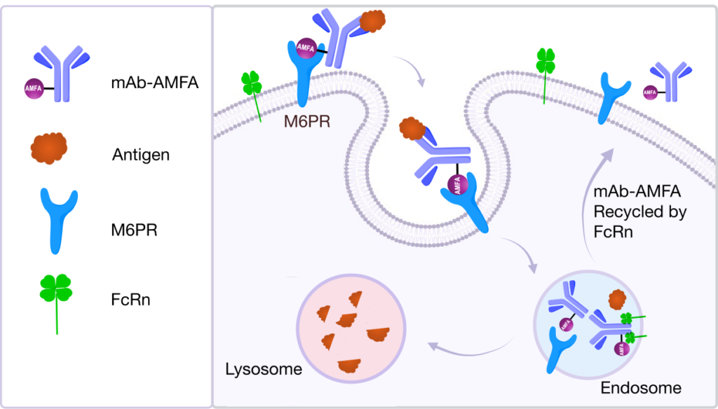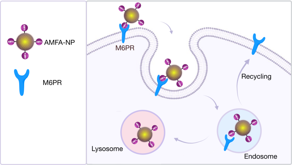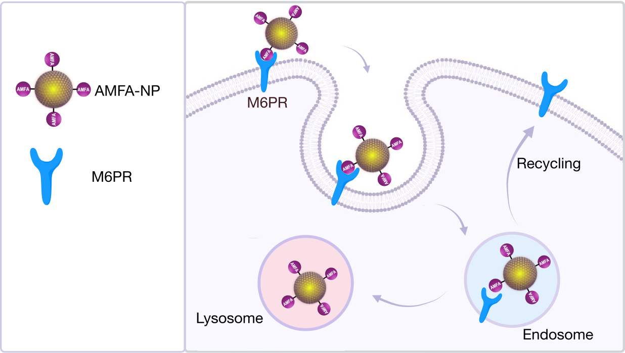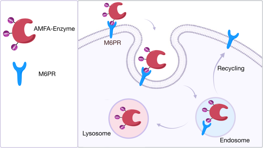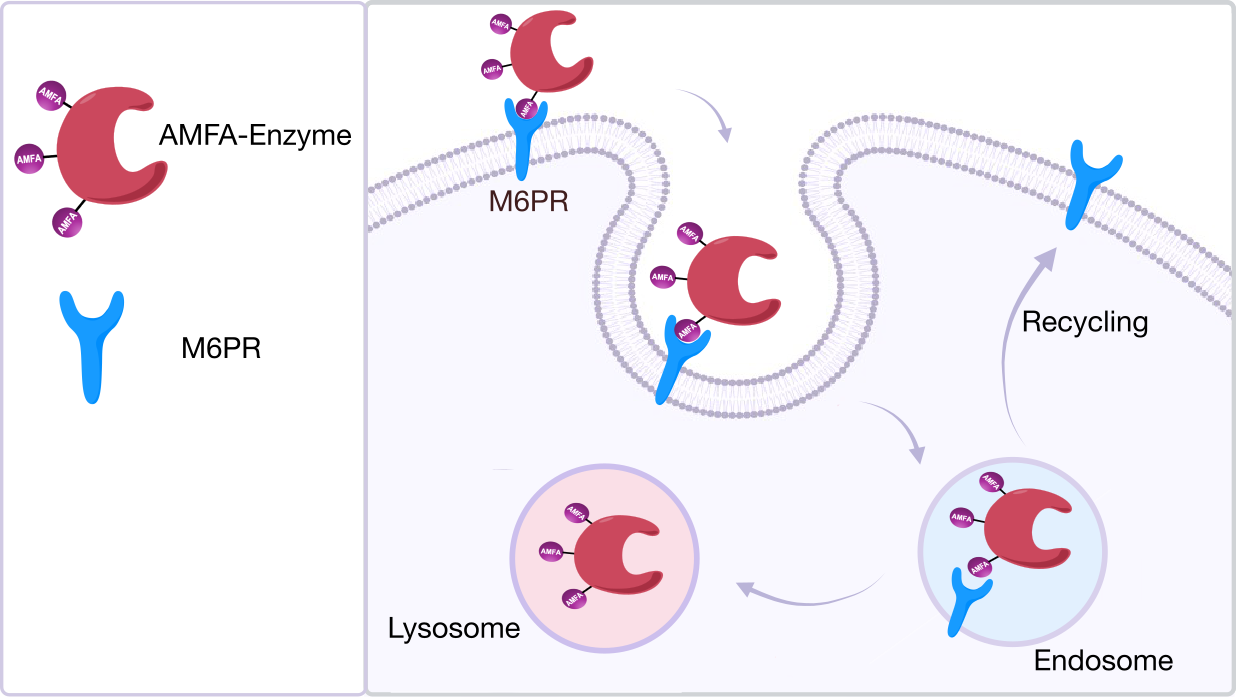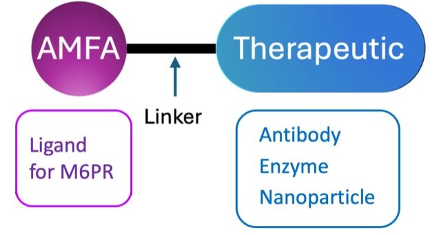 AMFA therapeutics are composed of an AMFA ligand conjugated to a therapeutic cargo such as an antibody, an enzyme, or a nanoparticle, and are designed to harness the natural M6PR trafficking pathway. This enables targeted delivery of the cargo into endosomes and subsequently lysosomes, where disease-related molecules can be degraded or activated.